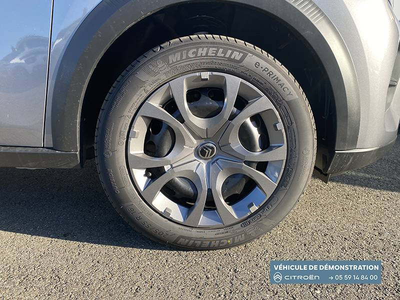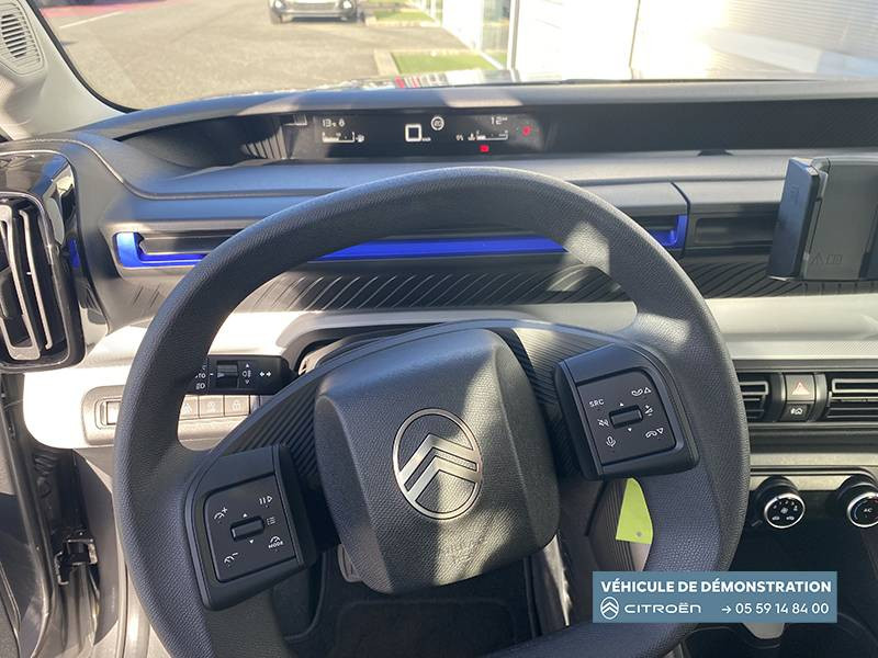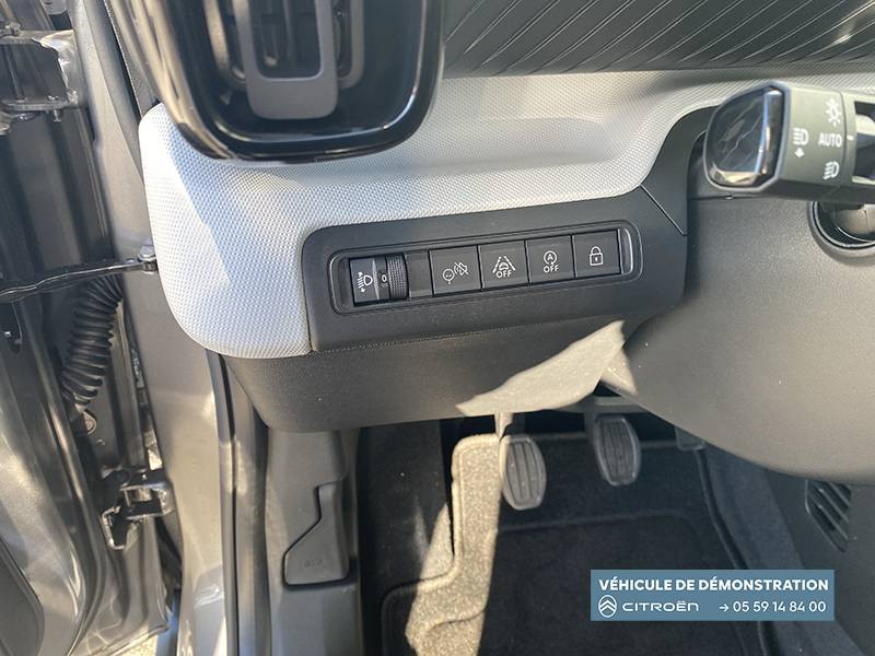 1 prise usb -c sur la planche de bord (charge rapide 3a) / abs avec ref, afu et esp / boîtier télématique : appel d'urgence et citroën assistance les services connect one pendant une période de 10 ans / citroën head up display (affichage tête haute) - lcd / coques de rétroviseurs extérieurs noir mat / détection de sous-gonflage / elargisseurs d'ailes noir mat / enjoliveurs 16" pyrite / garnissage tissu noir / tissu gris chiné avec les décors sur les panneaux de portes av/ar et sur la planche de bord ultra blue. / lève-vitres av électriques (descente séquentielle) / pack safety - active safety brake (freinage automatique d'urgence) - alerte active de franchissement involontaire de ligne - alerte attention conducteur - reconnaissance des panneaux de signalisation - régulateur-limiteur de vitesse - alerte risque collision / poignées de portes extérieures noir mat / station d'accueil smartphone radio via smartphone (avec application my citroën play), 2 hp en rang 1, commande de la radio sur le volant / suspension citroën advanced comfort / témoin de non-bouclage des ceintures de sécurité conducteur et passagers