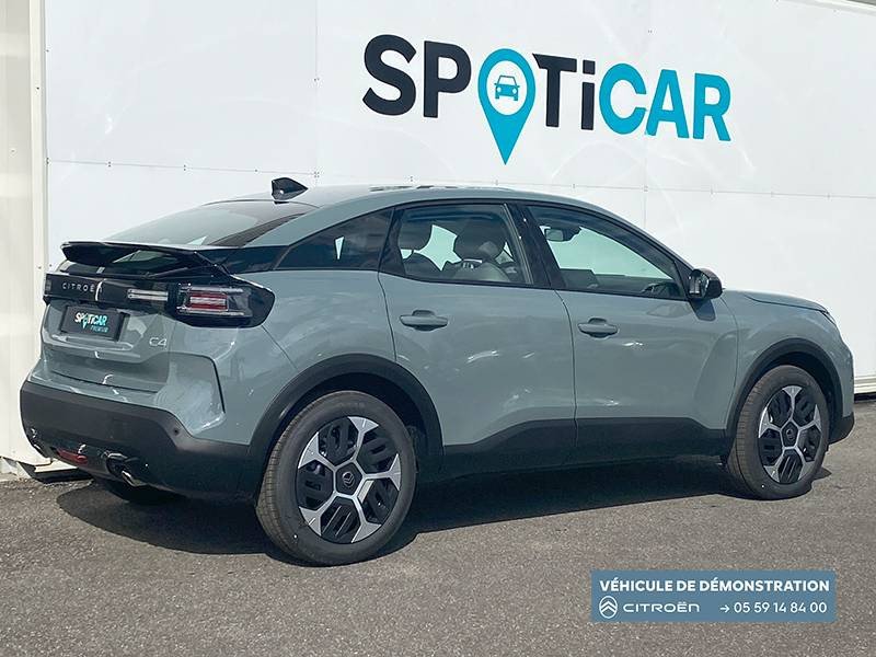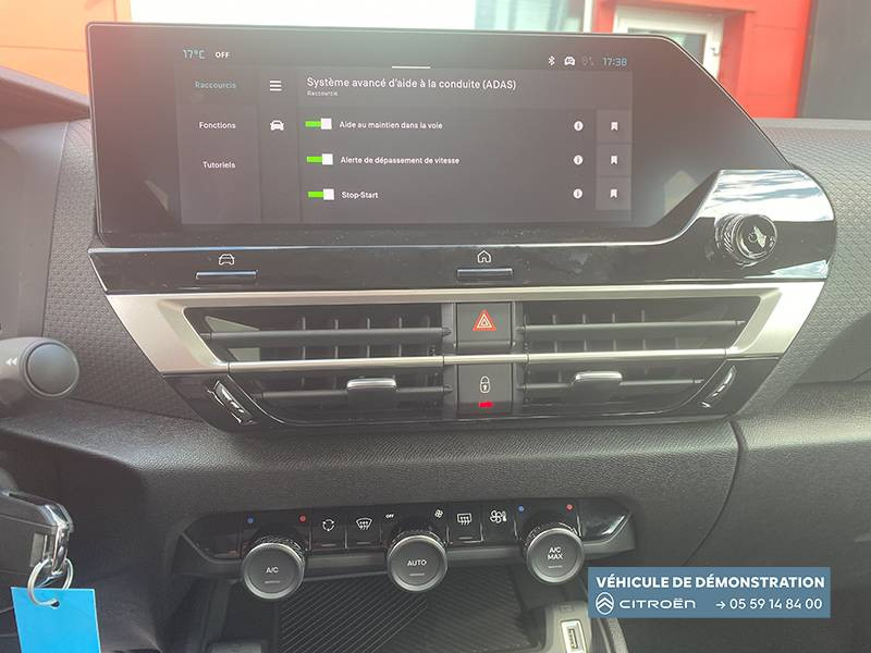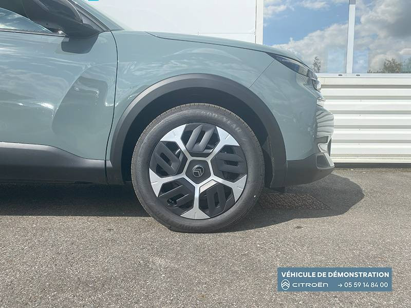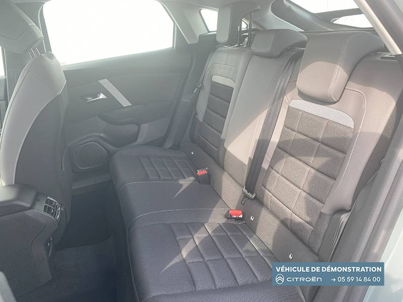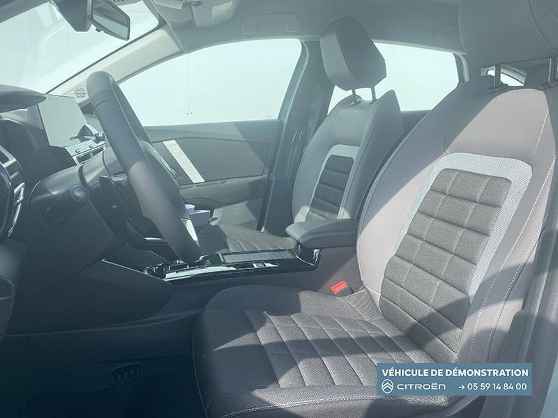 2 prises usb au rang 1 (1 type c + 1 type a) + 1 prise usb en rang 2 (type a) / abs + afu + esp + ref / accoudoir en tissu brasilia - noir mistral / aérateurs centraux en rang 2 / bande de dossiers en tissu curitiba blanc/noir / boîte automatique 6 rapports / clignotants impulsionnels / color clips pure black pièce de décor colorée sur les pare-choc. interchangeables disponibles en accessoire. / combiné numérique couleur 5.5" tft / commandes au volant du système audio et du régulateur-limiteur de vitesse / condamnation centralisée avec plip et condamnation automatique du coffre et des portes en roulant / console centrale haute avec rangements fermés et 2 porte-gobelets et accoudoir coulissant / décor de panneaux de porte injecté gris horizon / détection de sous-gonflage / direction à assistance électrique variable / eclairage d'accueil et d'accompagnement / ecran central 10" tactile: - système audio numérique (dab) 6 hps - apple carplay et android auto sans fil - reconnaissance vocale - kit mains libres bluetooth - boîtier télématique : appel d'urgence et citroën assistance / elargisseurs d'aile et bas de caisse noir mat / enjoliveurs 18" aerotech / essuie-vitre av automatique (capteur de pluie) / feux ar à led avec signature lumineuse / feux diurnes à led avec signature lumineuse / fixations isofix sur sièges latéraux ar (3 points d'encrage avec top tethertether) / frein de stationnement électrique automatique / garnissage tissu hello noir/toile enduite gris ambiance urban grey + sièges advanced comfort / jupe ar noir brilliant / kit de dépannage provisoire de pneumatiques / lécheurs de vitres latérales noir / médaillons de porte av en tissu brasilia - noir mistral / pack safety - active safety brake (fonctionne de 30 à 80 km/h et détecte les piétons et les cyclistes) - alerte active de franchissement involontaire de ligne - alerte attention conducteur - alerte risque collision - allumage automatique des feux de croisement - coffee break alert - reconnaissance des panneaux de vitesse et recommandation - régulateur-limiteur de vitesse - témoin de non-bouclage des ceintures de sécurité conducteur et passagers / pare-soleil avec miroir occultable côtés conducteur et passager / plafonniers av et ar à lampes / poche aumônière au dos des sièges av / poignées de portes extérieures couleur caisse / sabot av gris mercury satin / sécurité enfants mécanique / siège conducteur avec réglage lombaire / suspension citroën advanced comfort / tcs (contrôle de la traction)