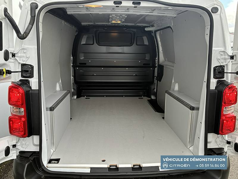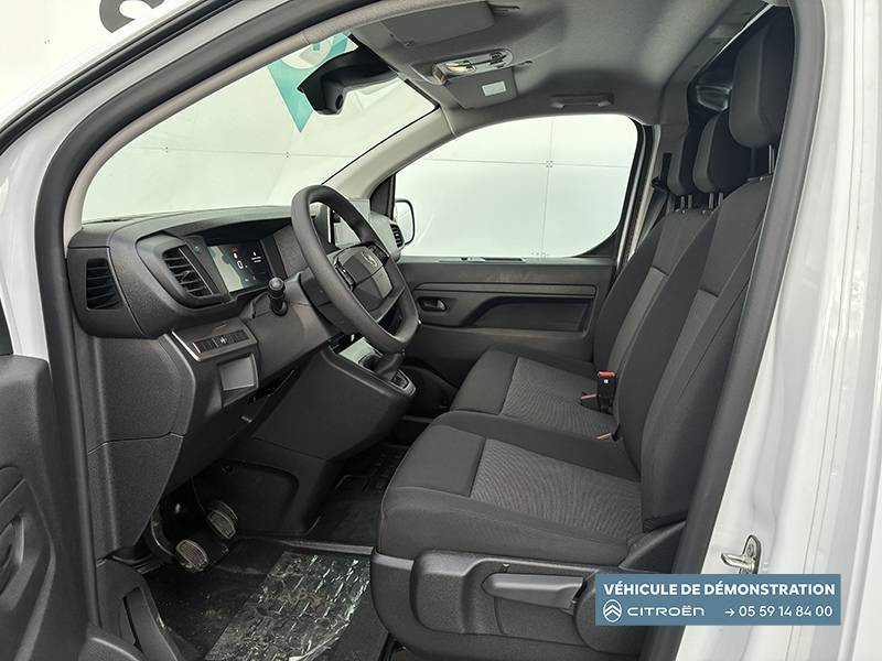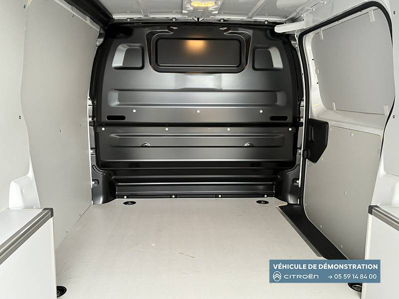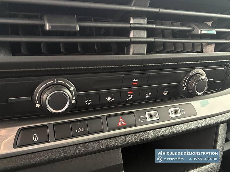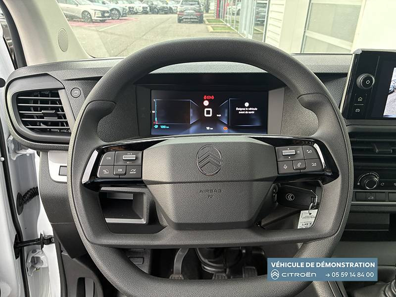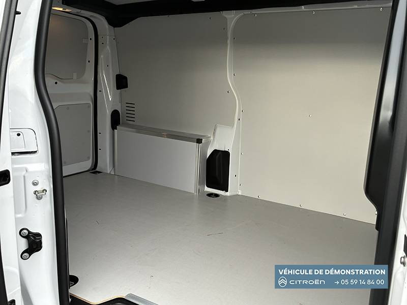 allumage automatique des feux de croisement et des essuie-vitres av / anneaux d'arrimage 6 répartis uniformément sur la zone de chargement / banquette passager 2 places avec appuis-têtes réglables en hauteur avec rangement sous assise / boucliers, poignées de portes extérieures, enjoliveur(s) de rail de porte latérale coulissante baguettes latérales et coques de rétroviseurs extérieurs noirs teintés masse / climatisation manuelle régulée en température / cloison pleine tôlée / combiné numérique lcd noir et blanc / connectivité via bta (appel d'urgence et d'assistance localisées + offres services connectés) sos & assistance : appel d'urgence automatique ou manuel par push sos, et mise en relation directe avec la plateforme d'assistance citroËn (24h/24-7j/7)teleservices : détection du besoin d'une intervention technique ou d'une opération d'entretien périodique et transmission au réseau citroËn pour prise de rendez-vous (pack connect one pendant 10 ans) / détection de sous-gonflage indirecte / jantes tôle 16" grises avec cabochon noir / jeu de clefs: 2 plips hf 3 boutons avec fonction selectivité / kit de regonflage pneumatiques (compresseur 12v + cartouche de produit de colmatage) / pack sécurité freinage automatique d'urgence avec alerte risque de collision, assistance au maintien dans la voie, commutation automatique des feux de route, détection inattention conducteur reconnaissance des panneaux de vitesse et recommandation / panneaux de garniture de type isorel en rang 2 et 3 / pare-brise feuilleté acoustique athermique / portes ar battantes 50/50 tôlées à ouverture à 180° avec verrou sur porte gauche uniquement / prise 12v (1200 w max) dans la boîte à gants / projecteurs h15 avec feux diurnes à lampes / radio rce (dab), écran 5'' monochrome tactile (2hp + 2 tweeters) + bluetooth + 1 prise usb / revêtement de sol tpo dans l'habitacle / sellerie tissu bi-ton noir-gris et garnissage / siège conducteur individuel avec appui-tête réglable en hauteur et avec accoudoir réglage : longueur, inclinaison, réhausse et lombaire / teinte de caisse opaque